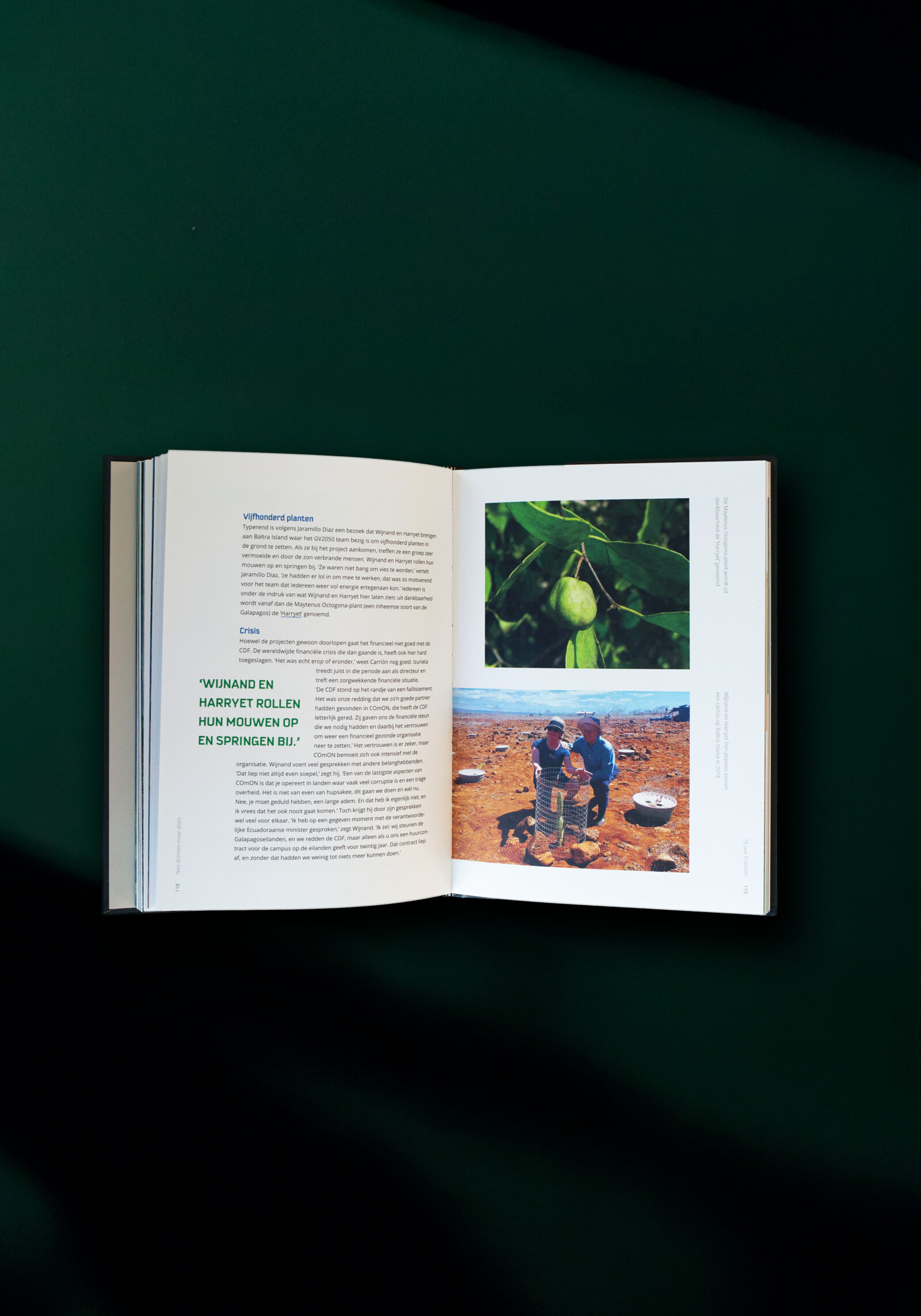 Het jubileumboek “Niet dromen, maar doen” beschrijft 10 jaar vergroening van de aarde en de ambities, dilemma’s en uiteindelijke focus van de stichting. Door het gebruik van inspirerende anekdotes, foto’s en verhalen (gedrukt op volledig duurzaam papier!) is het boek een kleurrijk geheel geworden dat de missie van COmON eer aan doet.